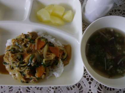 今日の献立は「和風カレー丼、もずくとオクラのとろり汁、りんご(缶)、牛乳」でした。和風カレー丼は、こんぶとけずりぶしの風味をきかせた和風のカレーを、ごはんかけて食べました。子どもたちには大好評でした。「もずくとオクラのとろり汁」は、とろみのあるもずくとオクラとえのきたけを具に使ったので、だしのうま味がいきたとろみのあるすまし汁でした。だしの香りがおいしく、とろみでのどごしのよいすまし汁でした。デザートには、甘酸っぱいりんごの缶詰がつきました。