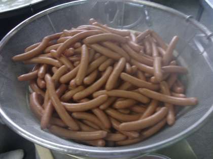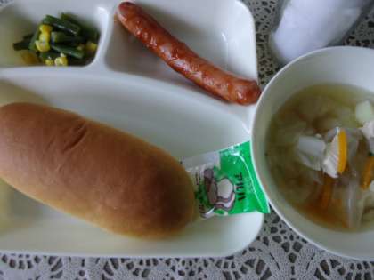 今日の献立は「大型コッペパン、マーガリン、ウインナーのケチャップソース、スープ、三度豆とコーンのサラダ、牛乳」でした。ウインナーは、粗挽きの細長いウインナーソーセージをボイルして、ケチャップ、デミグラスソース、ウスターソースで作ったソースをからめました。スープは、鶏肉、じゃがいも、キャベツなどが入った、彩りの良いあっさりとしたスープでした。サラダは、三度豆とコーンを使っていたので、緑色の中に黄色がちりばめられて、きれい色合いでした。