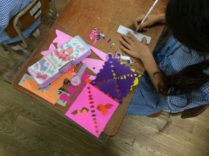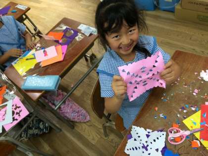 折り紙を折ってからはさみを入れることで、広げたときにどんな模様ができるかわくわくしながら作っていました。お気に入りの模様のかざりができて、笑顔いっぱいでした。