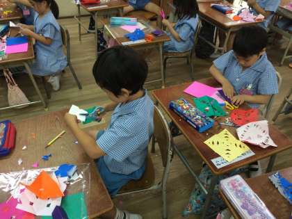 今週の図工の学習では、はさみを上手に使って、折り紙でかざりを作りました。