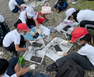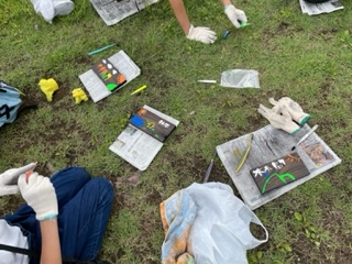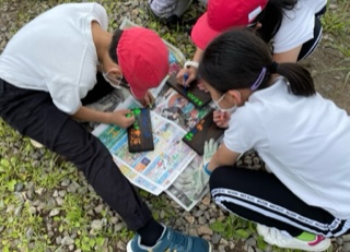焼き板活動。しっかり磨いてピカピカに。仕上げに、林間学習の思いを描きました。