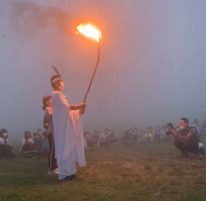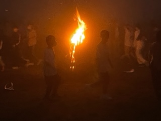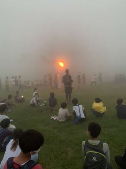 食後には、夜の活動・キャンプファイヤーを行いました。雨が心配され少し霧が出ている中でしたが、子どもたちの熱気で吹き飛ばしました。火の神から7つの火を授かり、キャンプファイヤーを点火後、キャンプだホイ・マイムマイムを踊り、猛獣狩りなどを楽しみました。