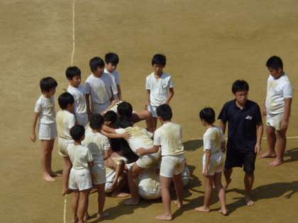 組体に慣れてきたとおもったら、大違いでした。今度は、太陽と砂がそとでまっているのです。はじめ、靴下をぬいだときは、「きもちいい!」と思いました。でも、一人技で変わりました。もう体は砂だらけで、ひざも痛かったし、すぐに体をはたいてしまいます。首やひざのうしろまで、砂だらけになりました。でも、砂や太陽にもまけないように頑張ります。