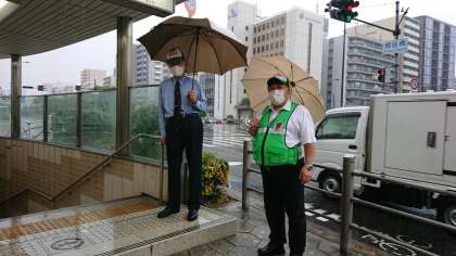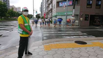 雨が降ったり止んだりの天候の悪い中、西六セーフティパトロール隊が登校時の見守りを行ってくださいました。