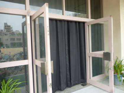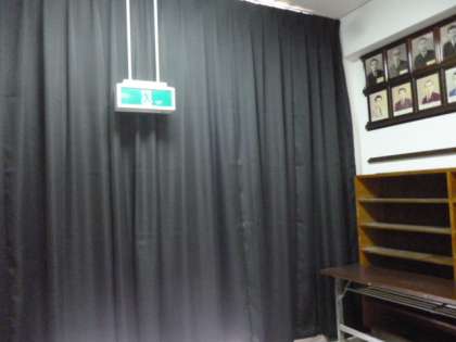 講堂に歴代PTA会長様のお写真を移設しましたので、お写真を紫外線から守るために、入口に遮光カーテンを取り付けました。日中はカーテンを閉めています。