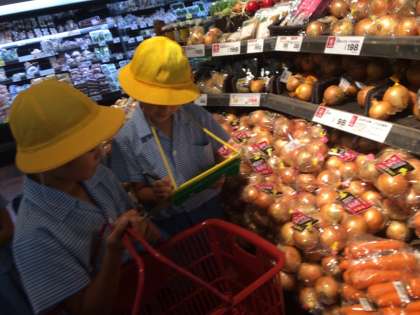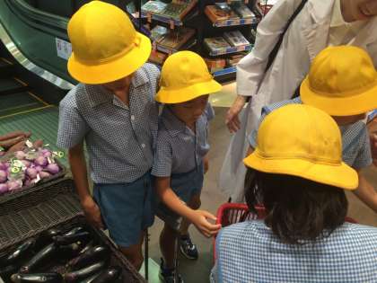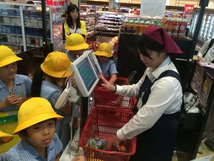 お店の売り場では見て・触れる体験をグループでお買い物ゲームをしながら学びました。