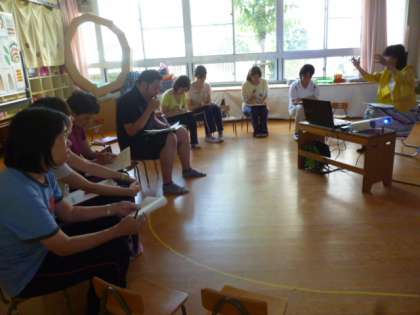 堀江幼稚園で行った、線描、パス・水彩絵の具を使用した効果的な描画方法の実技研修に堀江小学校の1年生担任も参加しました。