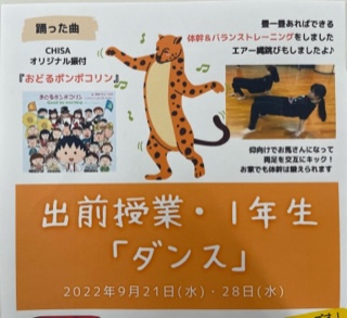 先週に続き、本日も1年生の出前授業がありました。本校の保護者でもあり「子どもの運動能力の向上」をテーマに取組をすすめる講師をお迎えし、楽しくダンスを学びました。体幹トレーニングも取り入れながら、45分間動きっぱなしの出前授業。子どもたちは、『おどるポンポコリン』のリズムにのって、楽しく一所懸命、活動しました。