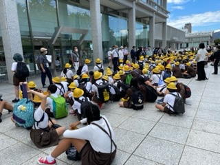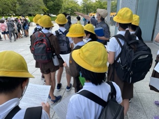 ボランティアガイドのみなさんに案内していただき、碑巡りをしました。子どもたちは、ボランティアガイドのみなさんの説明に熱心に聴き入っていました。