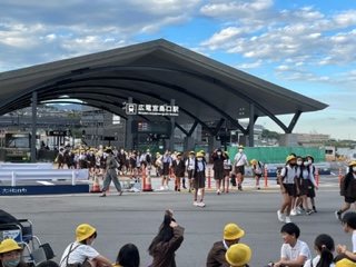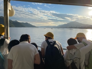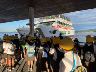 広電宮島口駅に到着。フェリーに乗船し、宮島へ向かいます。子どもたちは、デッキで潮風に吹かれながら、10分間のクルーズ?を満喫しました。
