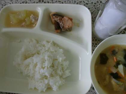 今日の献立は「ごはん、さけのつけ焼き、みそ汁、とうがんの煮もの、牛乳」でした。さけのつけ焼きは、さけの角切りに砂糖やこい口しょうゆなどで下味をつけて焼いたので、ごはんが食べやすい甘辛い味つけでした。夏が旬の野菜の一つとうがんは、下ゆでしてからしょうがの風味をきかせただしで煮ました。あっさりとした味わいの素朴な夏の一品でした。