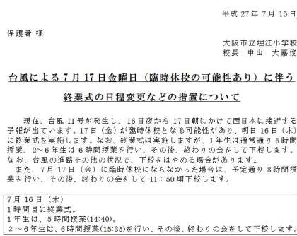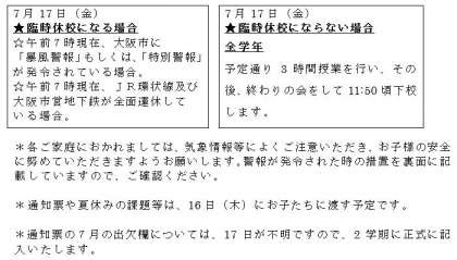 台風による7月17日金曜日(臨時休校の可能性あり)に伴う