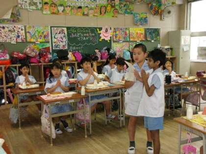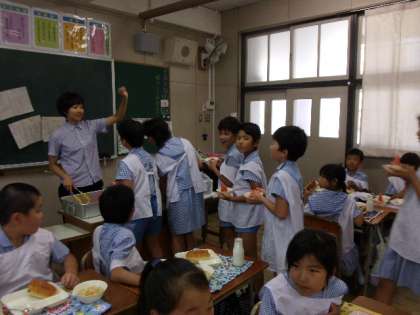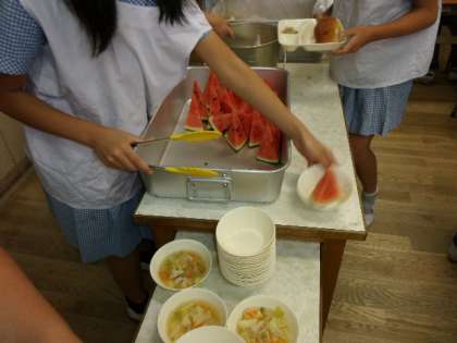 4年生の教室では、1学期最後の給食なので、全員が中心を向いたロの字型で楽しく食べました。すいかがすこし残ったので、先生とじゃんけんをして勝った人がゲットできました。