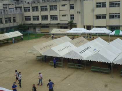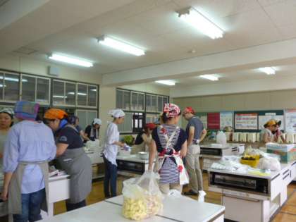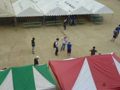 12時から運動場・講堂・1階教室で行う、堀小まつりのお店の準備が着々と進められています。皆さま朝早くからありがとうございます。
