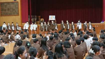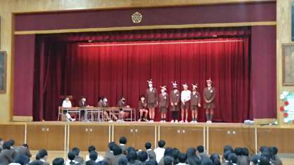 集会委員会がゲームや劇を通して149年の歴史ある堀江小学校の今の様子を伝えみんなでお祝いしました。地域の方のおかけで堀江小学校で学ぶことができることに感謝をし、お礼をお伝えして集会を終わりました。