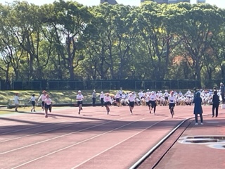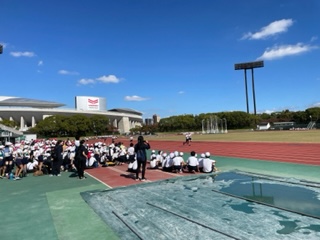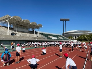 11月2日(水)6年生が西区のスポーツ交歓会に参加しました。全8校750名ほどの児童が集まり、陸上競技に取り組みました。汗ばむほどの快晴の中、ヤンマーフィールド長居のトラックを全力で駆け抜けました。全員が100mを走り切り、その後800m走かリレーを選択し精一杯走りました。競技の合間には、他校の児童と仲睦まじく会話をする姿が見られるなど、有意義なひとときを過ごしました。