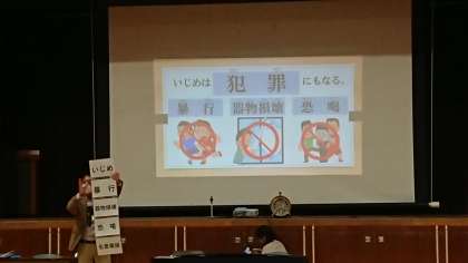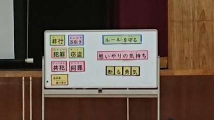 SNSでのいじめも含め、いじめや万引きは犯罪であることを分かりやすく教えていただきました。