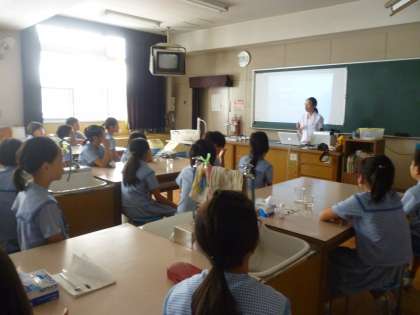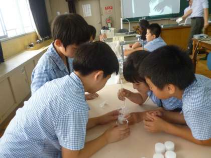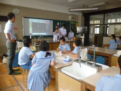 7月には「理科の出前授業」があり、株式会社テクノーブルの方に来ていただき化粧品や紫外線について学習し、日焼け止めクリーム作りの体験をしました。