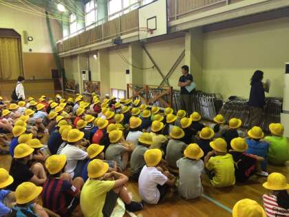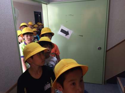 放送を聞いて室長を先頭に、リュックサックを持って1列に並んで静かに避難しました。