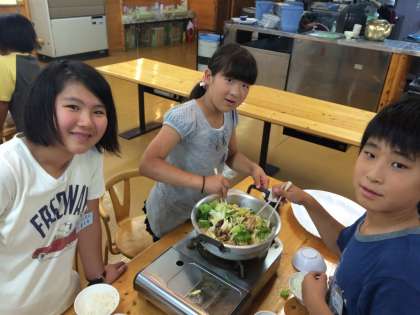 みんなですき焼きを協力して作り、楽しく食べています。