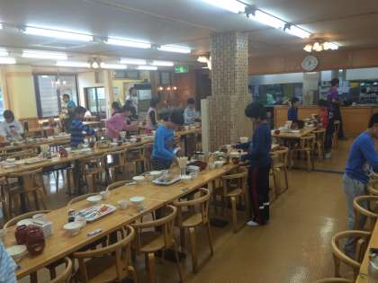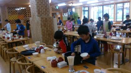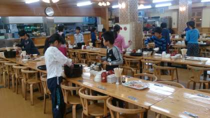 食事係が先に朝食の用意をしています。
