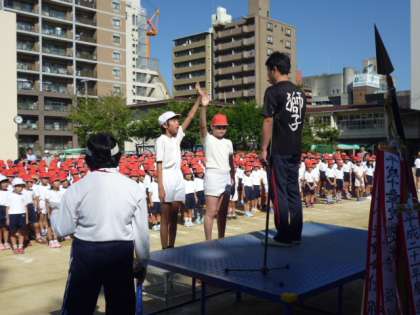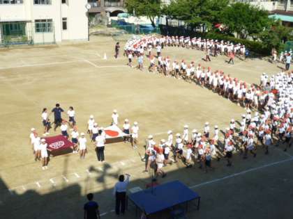 今日は、初めての1年生から6年生全員での全体練習です。昨年は、新校舎の増設で校庭が使えず、ひろーい京セラドームで行いましたが、今年は本拠地に戻って、ドームと比べれば、かなり狭い校庭での開催となります。みんな手際よく機敏に動けるよう練習しましょう。