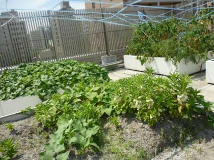 貯水タンクよりも高い位置にあるため、水圧が弱く水やりに時間がかかりますが、学習のための野菜などを植えて観察や栽培を行っています。