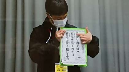 今週の生活目標について説明しました。曲がり角では車が曲がってくる場合があるので、右左を見て渡りましょう。また、黄帽をかぶって登下校することも安全につながることです。
