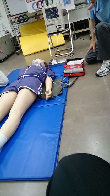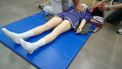 腕や首で脈を打ち、声が出て、目も開閉し瞳孔の大きさも変わる人形を使って、より実践に近い、救命処置(心肺蘇生・人工呼吸とAEDによる除細動)を行いました。
