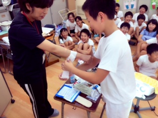 実際に保健室にある道具を使って、擦り傷や鼻血の時の処置の仕方を