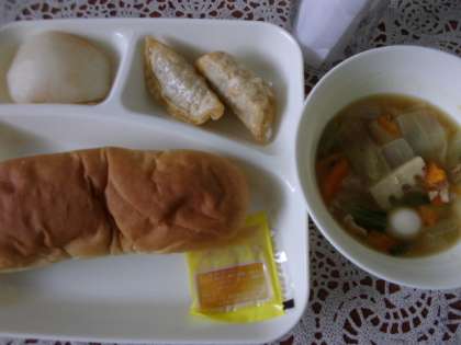 今日から2学期の給食がはじまりました。今日の献立は、「大型コッペパン、アプリコットジャム、鶏肉と野菜のうま煮、あげギョーザ、なし(二十世紀)、牛乳」でした。