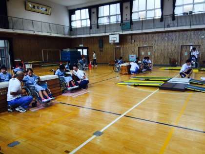 いよいよ車いすで障害物のコースを渡りました。段差や狭いところは難しいです。