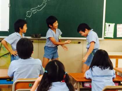 都道府県クイズの途中で、大阪が答えの時にお笑い係さんがミニコントをしてくれました。大阪のお笑い文化を転校生の子に紹介してくれました。
