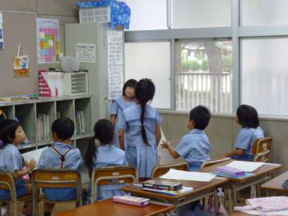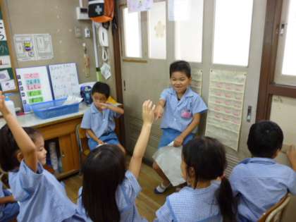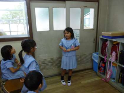 夏休みの思い出をみんなの前で話す学習をしました。話す内容や話し方、聞き方を考えて、二人組で練習した後、4つのグループに分かれて発表会をしました。質問がいっぱい出て、楽しい発表会でした。