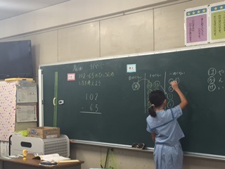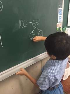 一人で考えてノートに書いたことを、黒板に書いてみんなに発表しました。