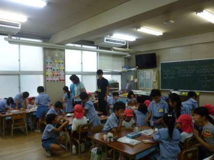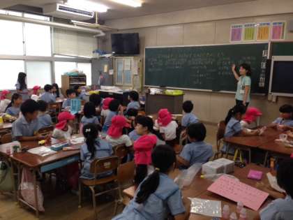堀江幼稚園の園児が2年生と手作りおもちゃを使って交流しました。