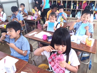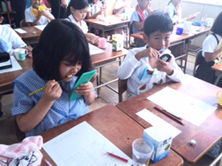 子どもたちは正しい歯の磨き方を教えてもらい、えんぴつの持ち方で、優しく磨いていました。