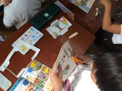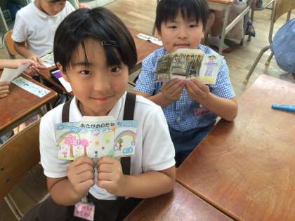 大切に育てたあさがおの種とりも終わりました。春に自分たちがしてもらったように、来年の1年生のためにたねのプレゼントを作ります。今日は、たねを入れるためのふくろを作りました。みんな下級生が喜んでくれるように、可愛い絵をたくさん描きました。