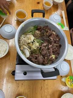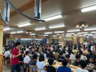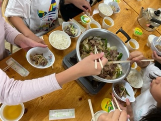 1日目の夕食の時間です。今日のメニューはすき焼きです。いただきますをしてすぐにご飯のおかわりをする子も。食欲旺盛です。みんな、美味しくいただきました。