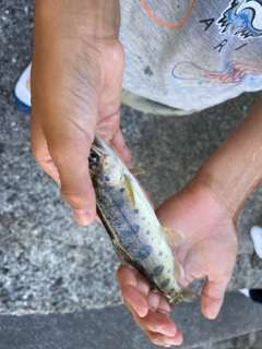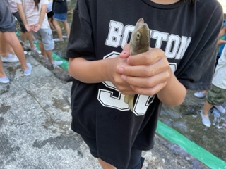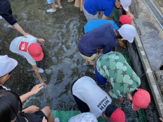 魚つかみを楽しみました。素早く逃げる魚を必死に追いかけ、魚のぬるぬるした感触に悲鳴をあげながら、一所懸命魚をつかみました。つかみ取った魚は、美味しくいただきました。