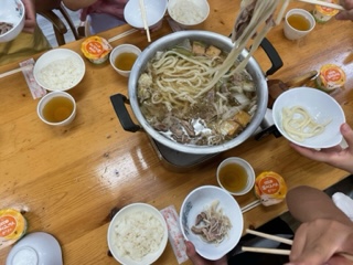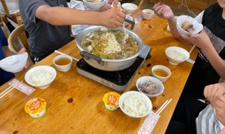 子どもたちが楽しみにしてる、夕食の時間です。2日目のメニューは、カモ鍋です。出汁をしっかり吸ったうどんも、美味しくいただきました。