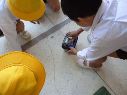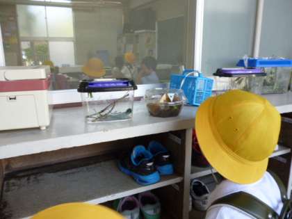 休みの日に、カマキリやバッタをつかまえて学校に持ってきてくれました。夢中になって世話をしています。校内でも、コオロギやバッタ探しに夢中になっています。