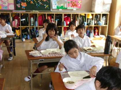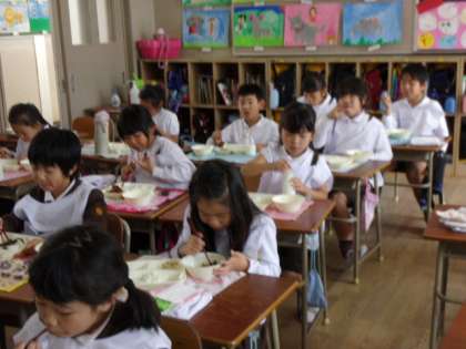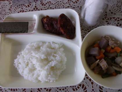 みそカツを見た子どもたちは、とってもうれしそうです。しかし、ごぼうやれんこんは少し苦手なようで、少し残っているおかずがなかなか減りません。そんな中、しっかりおかわりする子もいます。これから、旬の根菜類が給食によく登場します。根菜類はしっかりかんで食べる野菜です。かむことは、脳の発達とも関わりがあると言われています。ご家庭でも、根菜類を取り入れてみてはいかがでしょうか。