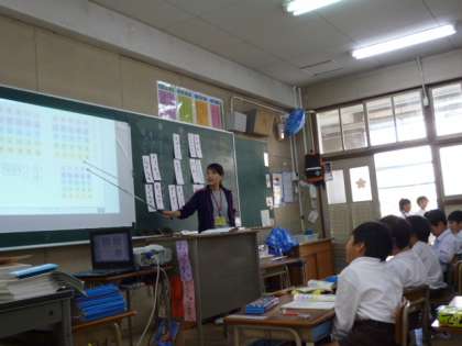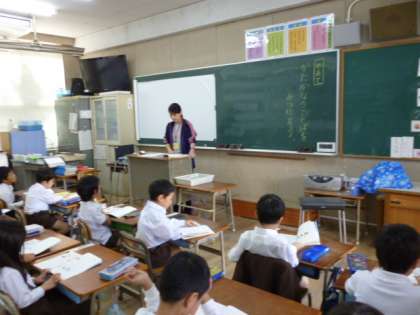 3組にきている教育実習生が初めて授業をしました。「サラダでげんき」の中から、かたかなをさがしてみんなで読みました。みんな真剣に取り組んでいます。