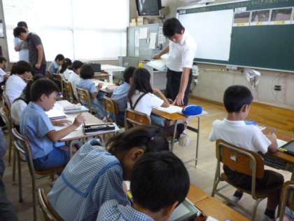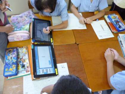 教職員のためのICT公開授業に向けて、タブレットや電子黒板などのICT機器を活用した研究授業を実施しました。その後、教育センターの指導主事を迎えて教職員が、今日の授業を検討しました。