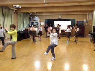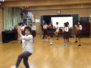 運動会で「ふれあい演技」担当児童に、女性会の方が「河内音頭」のご指導をしてくださいました。