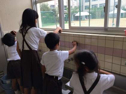 先日、6年生が掃除の時間に手洗い場の掃除の仕方について教えてくれました。