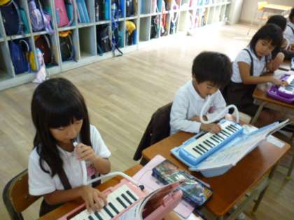 音楽の時間に音の高さを意識するため、高さに合わせて腕をうごかしながら、ドレミで歌いました。そのあと、鍵盤ハーモニカを演奏しました。