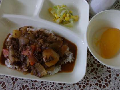 今日の献立は、「ハヤシライス、野菜サラダ、黄桃(かんづめ)、牛乳」でした。