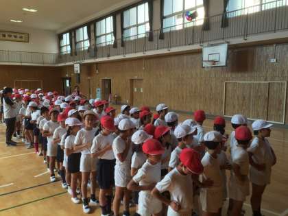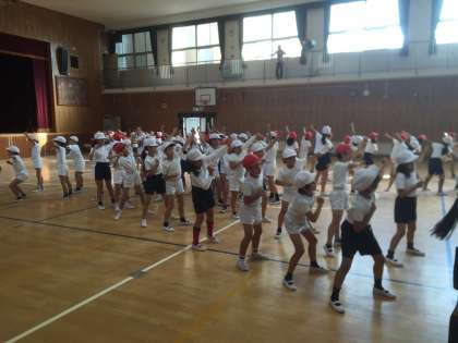 運動会まであと少しになりました。子どもたちは毎日、練習を頑張っています。本日は講堂での練習です。徒競走や台風の目の並び方の確認を行い、ダンスは最後のポーズや退場の練習をしました。
